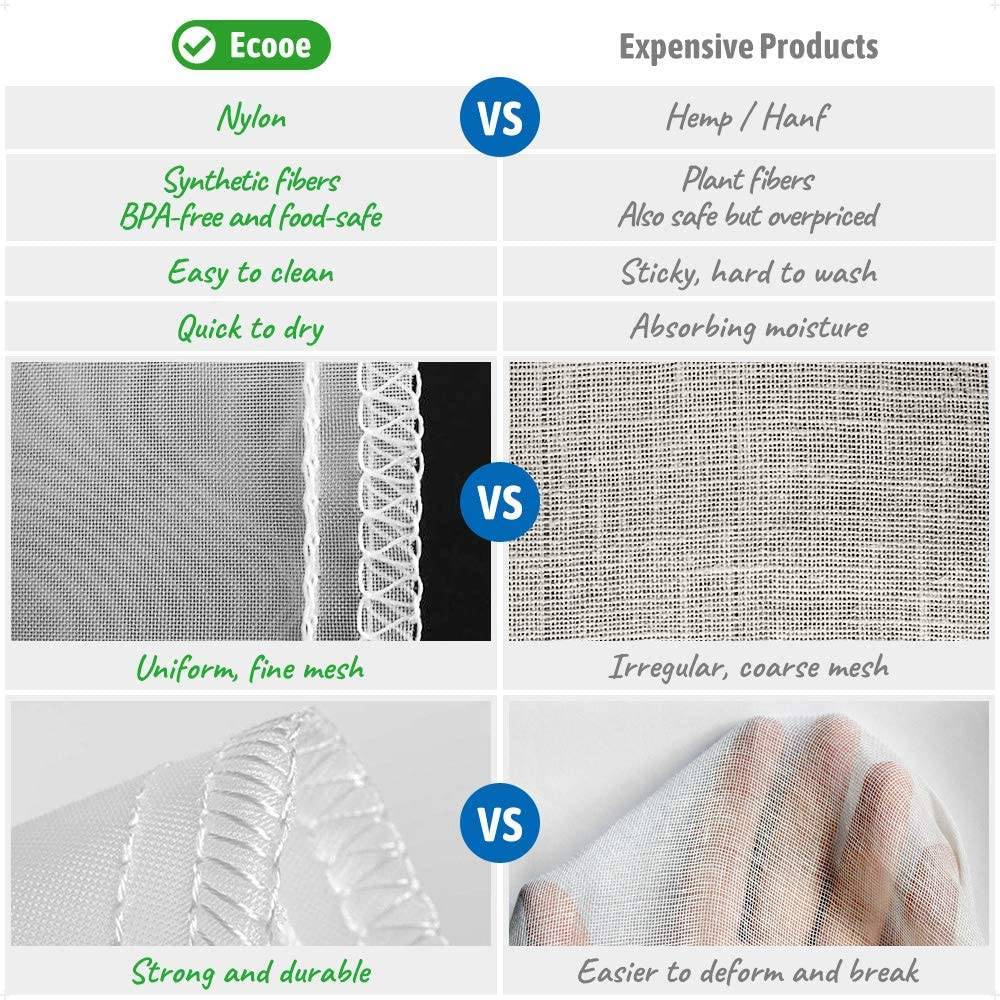 ECO-FRIENDLY AND DURABLE: Made of BPA-free food-grade nylon that is safe and odorless, and with reinforced stitching. Compared with vegetable hemp fiber, our nylon mesh is uniform and much finer, also stronger and less deformed.