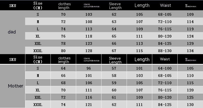 Suitable height: Father s size, Father M size, Father L, father XL, father 2XL, father 3XL, Mother S, Mother M, mother size L, mother XL, mother 2XL, mom 3XL, children 4T, children 5T, children 7T, children 9T, children 10T, children 11T, baby 3M, Baby 6m, Baby 9M, baby 12M, baby 18m, Dog S, dog L